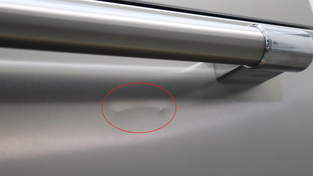 1-SMALL DINGED AREA ON THE BOTTOM FREEZER DOOR BEHIND THE HANDLE